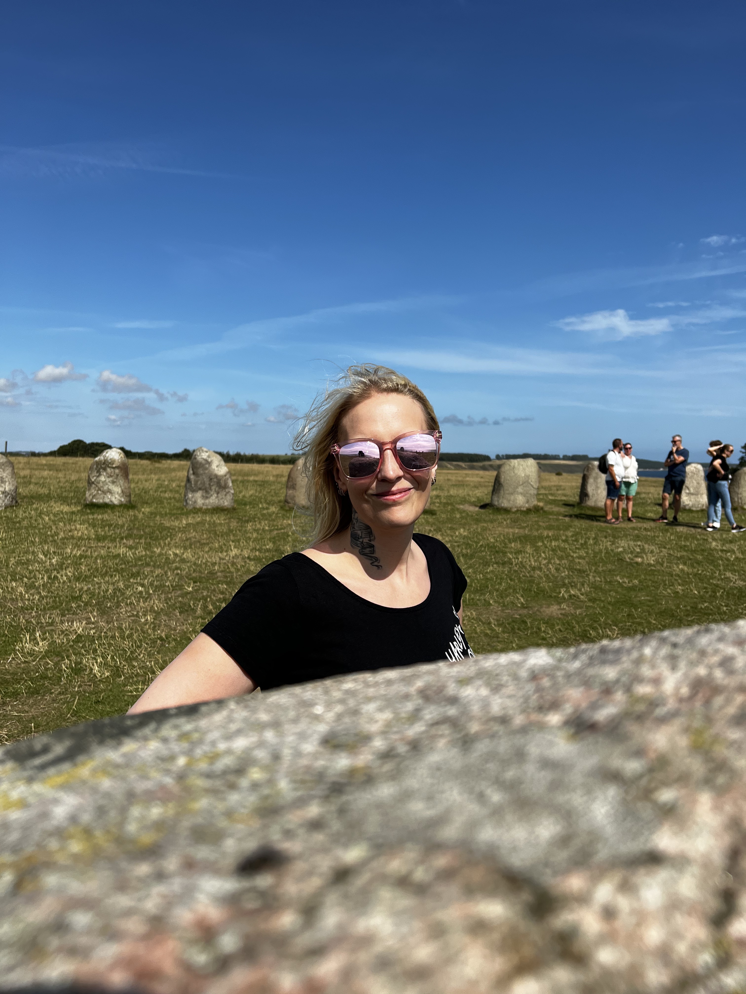 La montée le long d’un sentier en terre nous mène finalement au sommet de la colline, où un drôle de spectacle nous attend. Les pierres majestueuses d’Ales Stenar se dressent au milieu d’une vaste étendue d’herbe, tandis qu’une vingtaine de vaches paisiblement en liberté broutent ici et là au milieu de centaines de touristes. À notre grande surprise, de nombreux parapentistes ont choisi ce lieu cette journée-là pour leurs vols au-dessus des falaises. Cette juxtaposition d’éléments nous offre une vue pour le moins cocasse de cet endroit autrefois empreint de mystère.
