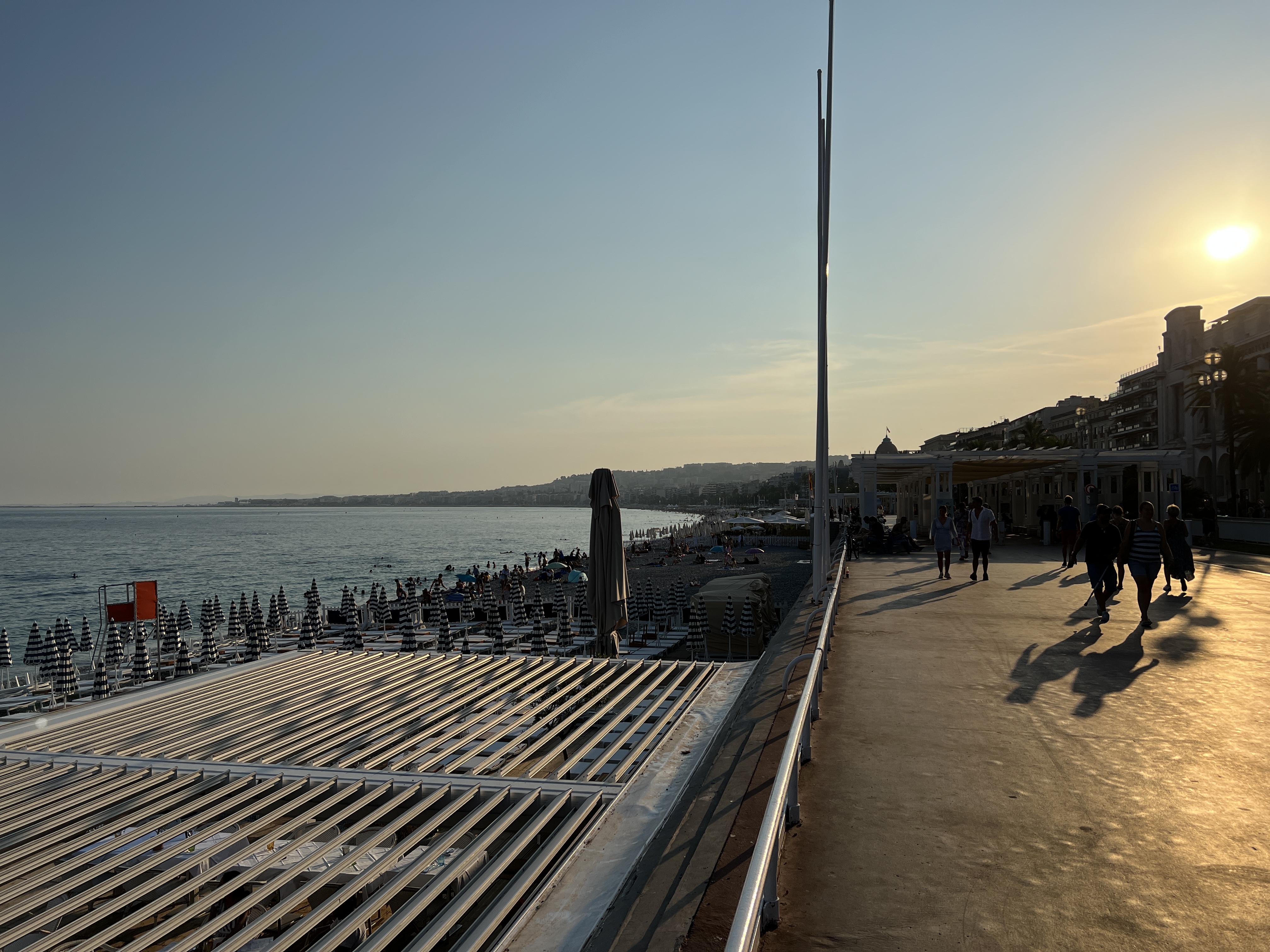 Encore une journée de canicule avec des températures avoisinant les 38 degrés. Nous avons décidé de partir en fin d’après-midi pour profiter d’un moment à Nice et découvrir la célèbre Promenade des Anglais. Comme le veut notre tradition dans chaque grande ville que nous visitons, nous avons fait une escale au Hard Rock Café. Le soir, nous avons savouré un délicieux dîner au restaurant La Vela, offrant une vue imprenable sur la baie des Anges. Pour clore cette journée, nous nous sommes installés sur la plage de galets voisine, où nous avons enfin pu profiter d’un rafraîchissant moment les pieds dans l’eau.