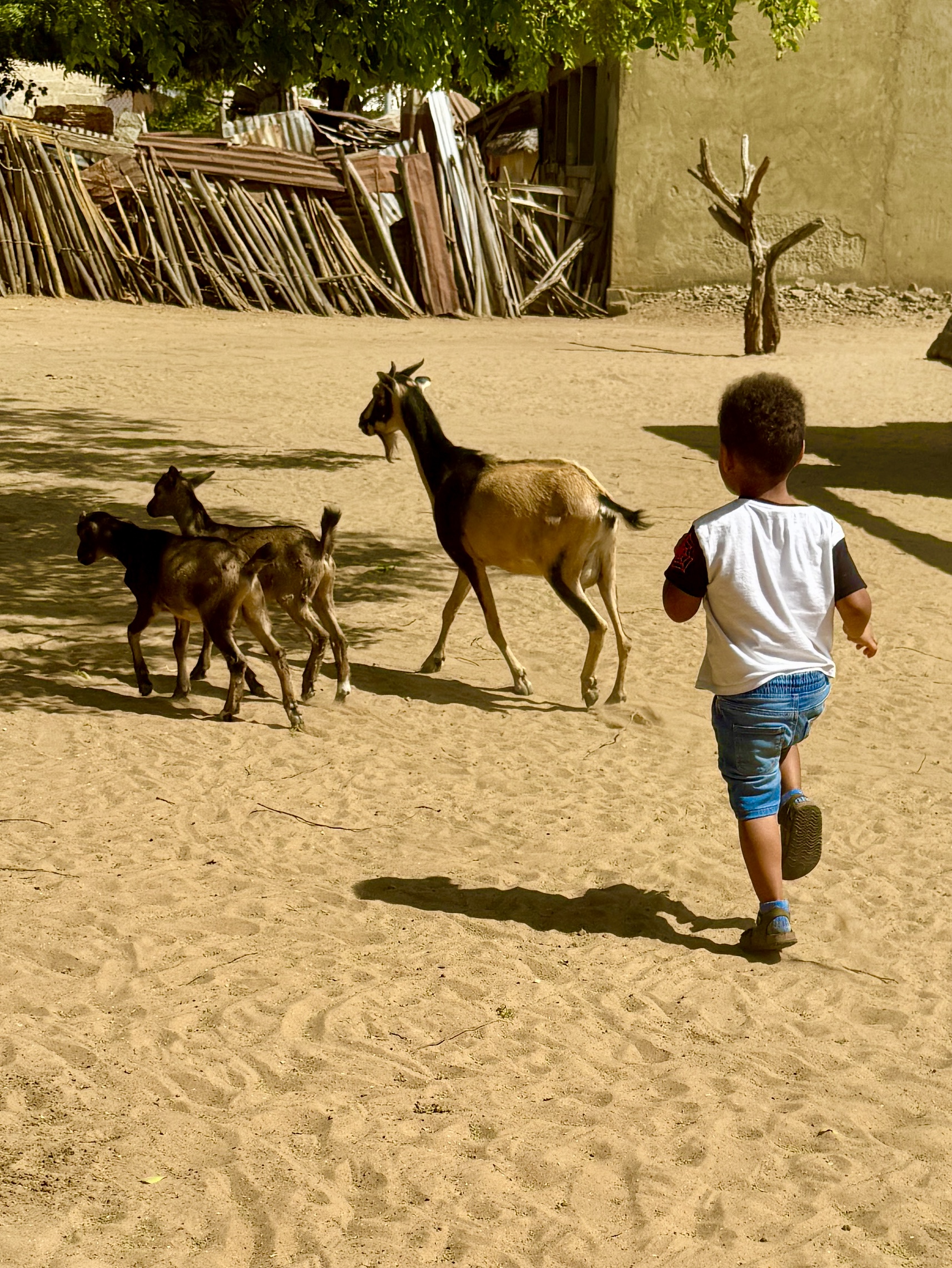 À Marlodge, immersion dans un village sans électricité où un tamtam en bois sert de « téléphone » local. Victor, notre neveu, court après les chèvres en liberté, hilare. L’ambiance est paisible, hors du temps.